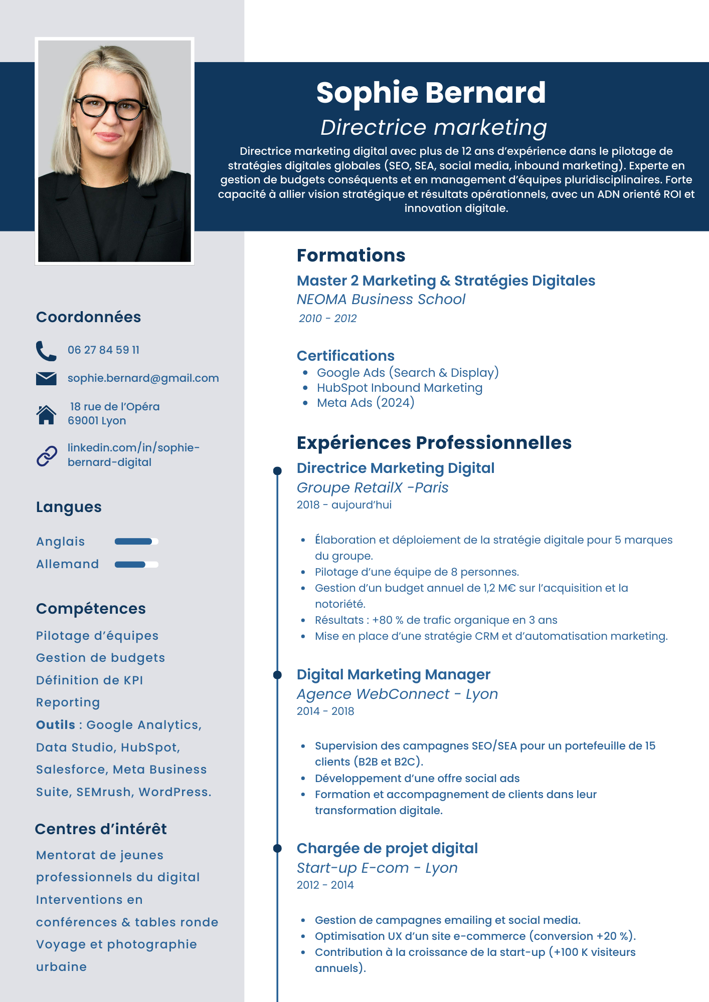 Il est inutile de lister toutes les formations depuis le bac : l’accent doit être mis sur les diplômes et certifications pertinents pour le marketing digital. Il est aussi recommandé de mettre en avant les spécialisations ou modules clés quand ils sont directement liés au poste. Par exemple : SEO, SEA, data marketing, réseaux sociaux, analytics.