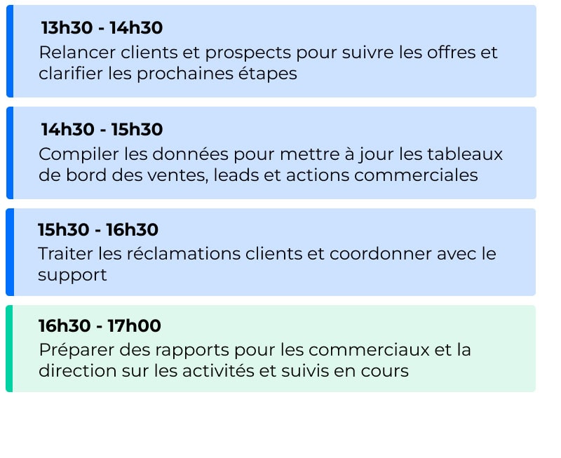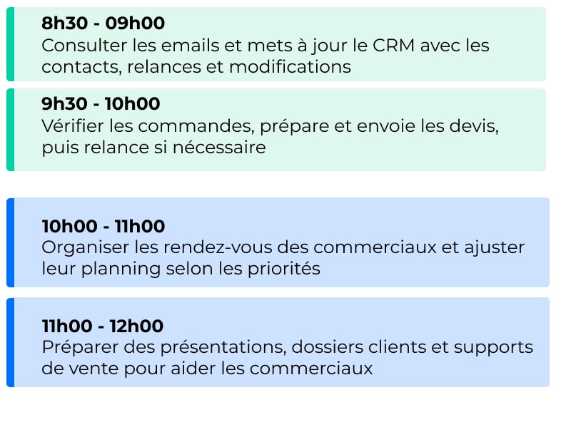 Tout au long de la journée, l’assistant(e) commercial(e) joue un rôle central de facilitateur, veillant à la fluidité des échanges entre les équipes internes et les clients. Sa journée-type est rythmée par la gestion administrative et le soutien opérationnel à l’équipe de vente.