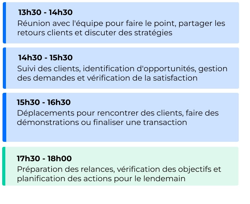 Être commercial exige une grande polyvalence, avec un agenda qui s’articule autour de la prospection de nouveaux clients, de la négociation des contrats, du suivi des ventes et du développement des relations clients pour atteindre les objectifs commerciaux de l’entreprise.
