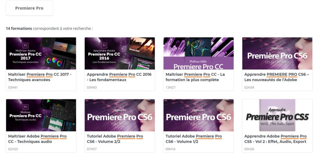 Voici un exemple des différents tutoriaux disponibles pour apprendre avec Premiere Pro :
